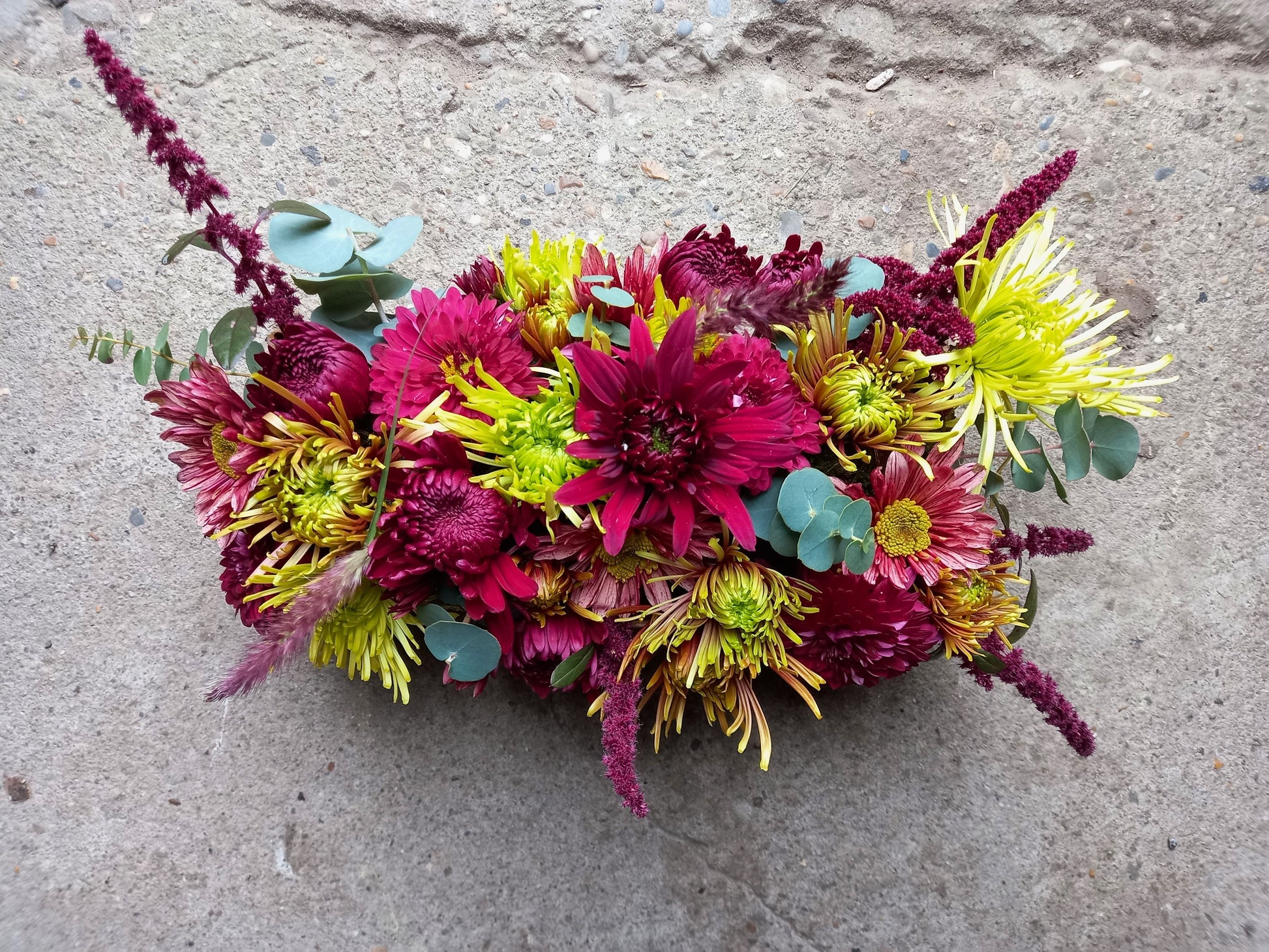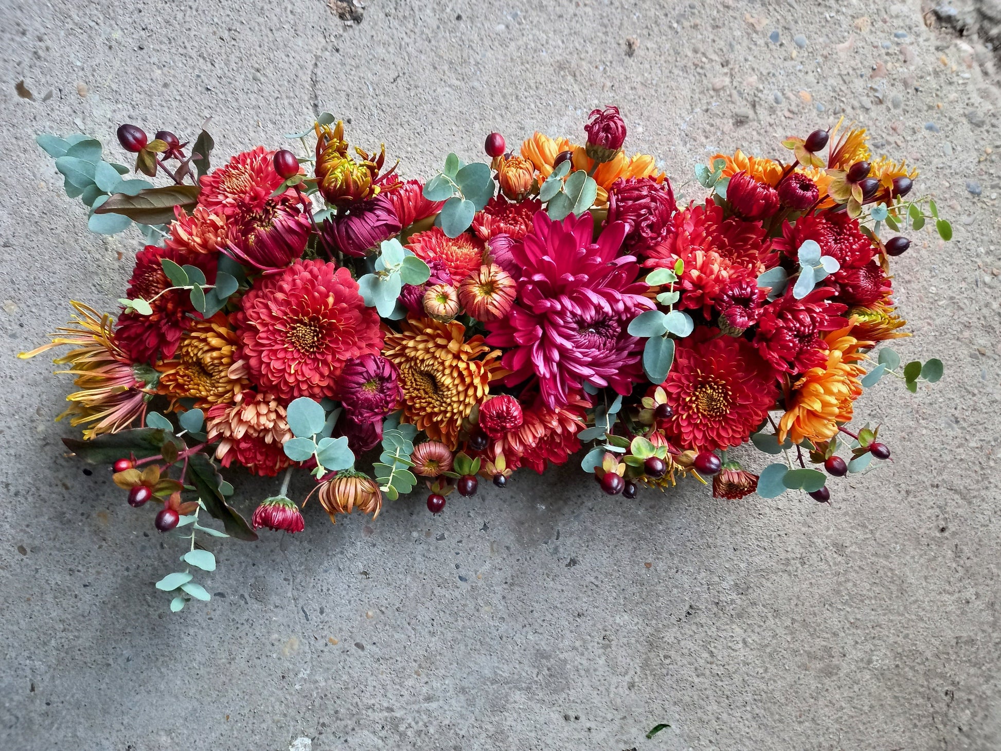 Een uniek (graf)stuk met lokaal geteelde chrysanten en wat de natuur te bieden heeft.