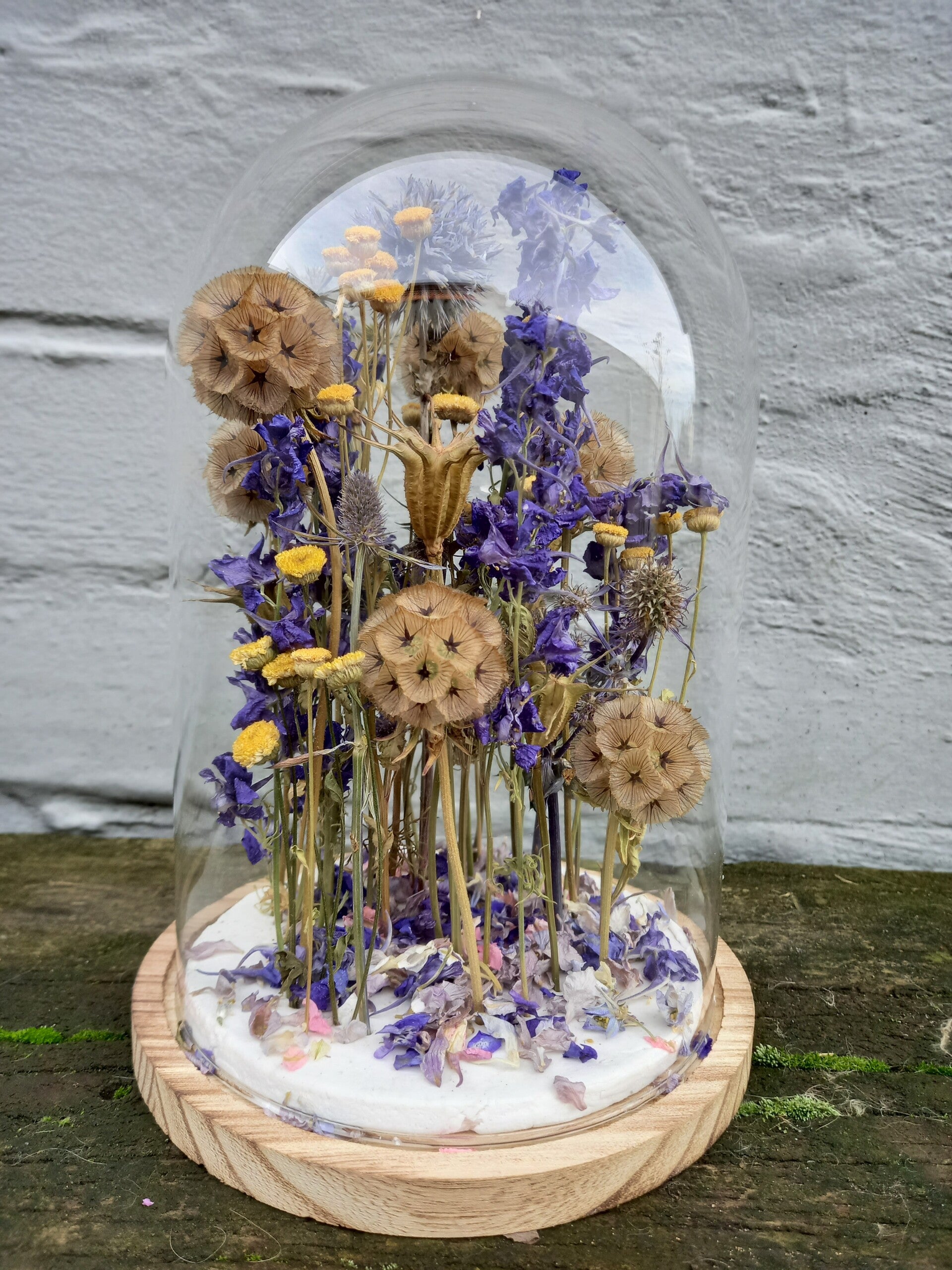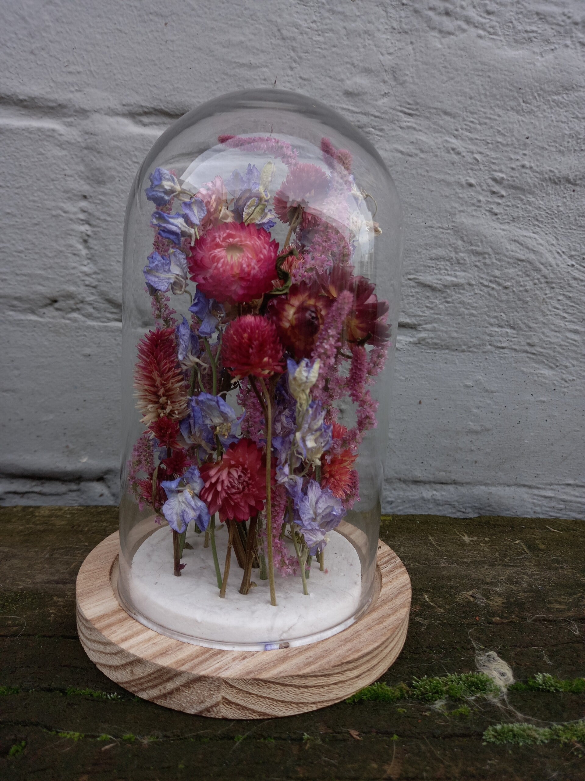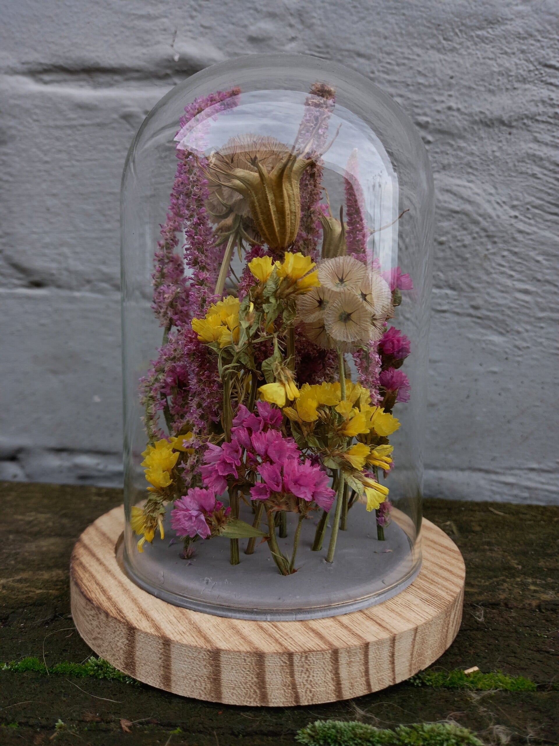 Afgelopen zomer droogde ik met veel zorg bloemen van eigen teelt, om zo de donkere winterdagen door te komen. Met zorg stel ik deze minituintjes voor jou samen.